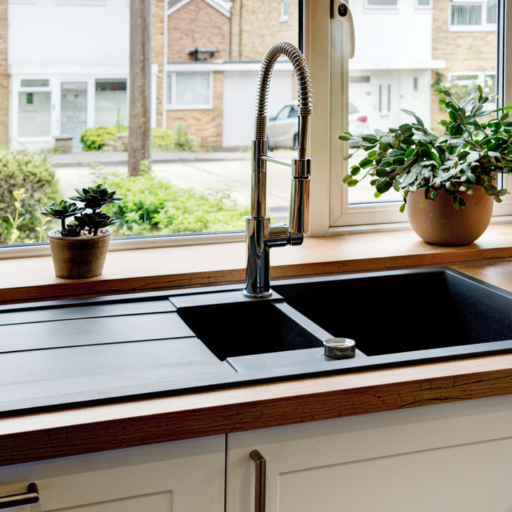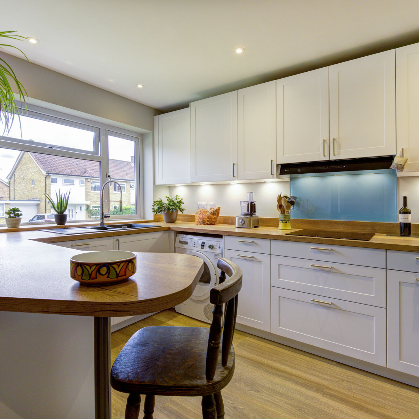 The kitchen units are finished in a crisp Crystal White paired with NCS S6010-B70G, creating a balanced and inviting colour palette. The worktop, crafted from Laminate Natural Vintage Oak, introduces a warm, organic texture that complements the overall design. The sink and tap are equally impressive, with the Blanco Metra Silgranit sink in Anthracite providing a sleek and durable focal point, paired with the Blanco Catris-S tap in Chrome, which adds a touch of modern elegance. The splashback, made from Decoglaze Sky, introduces a soothing blue tone that enhances the calming ambience of the space. The floor, finished with Karndean Van Gogh in Warm Brushed Oak, ties the room together with its natural beauty and resilience. Finally, the kitchen is equipped with high-quality Neff appliances, ensuring that the space is not only beautiful but also highly functional and reliable. This project is a shining example of how thoughtful design can turn even the most modest of spaces into a kitchen that is both stunningly unique and perfectly practical.